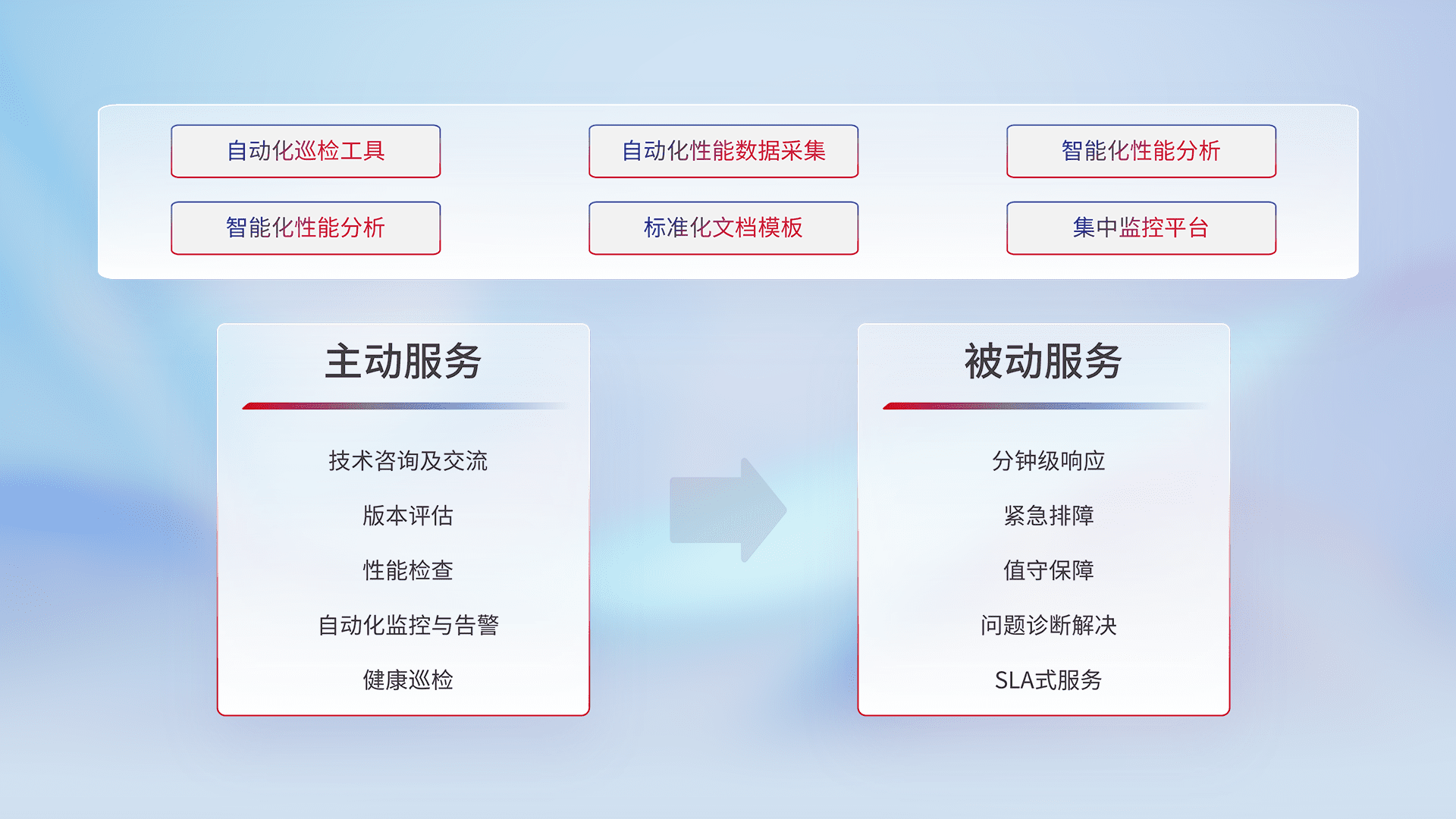 智能化工具和标准化文档,,,保障服务质量,,提供主动服务(包含技术咨询、、、版本评估、、、、性能检查、、自动化监控与告警、、、、健康巡检)和被动服务包含(分钟级响应、、、紧急排障、、值守保障、、、问题诊断解决、、、、SLA服务)。。