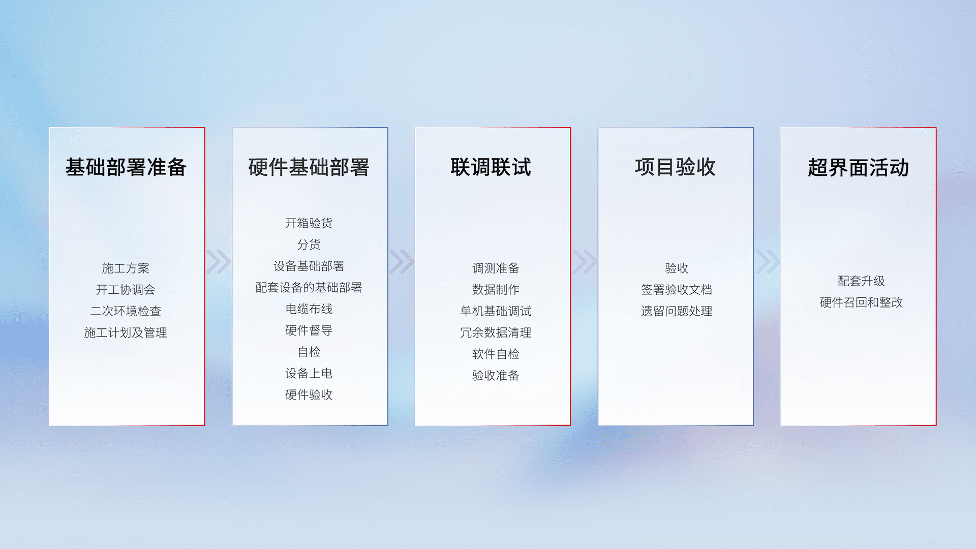 从基础部署准备、、硬件基础部署、、、联调联试、、、项目验收、、越界面活动的全过程可追溯,,,保证施工质量和进度。。。